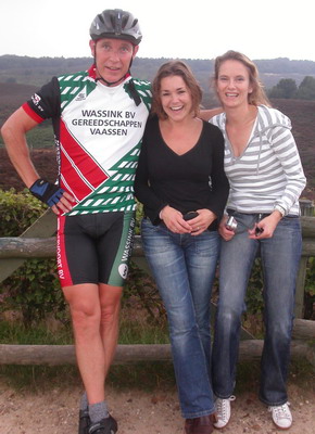 Aangekomen bij die bulten even flink op de pedalen en je weet weer waar je staat met je conditie. Bovengekomen een leuk plekje zoeken bij het uitkijkpunt om die cake soldaat te maken. Stonden daar net twee aardige dames foto´s van elkaar te maken, Erik bood aan om ze er samen op te zetten. En dan is er altijd wel weer een Dieker in de buurt die ook graag op de foto wil en dit alleraardigst plaatje komt verstoren. Als troost voor dit ongemak heb ik deze dames ook maar een stukje van onze overheerlijke cake aangeboden waarna zij ons ook nog op de digitale plaat vastlegden.