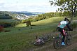 Uiteindelijk kwamen we via schitterende weggetjes (en niet weggetjes) in Daun aan, alwaar we eerst maar eens, in een lekker zonnetje op een terrasje, van een kopje koffie met apfelstrudel (o.i.d.) konden genieten. Met moeite konden we ons van het terras losweken, maar we moesten toch verder op zoek naar het Bike Park…Waarschijnlijk stond de zon verkeerd in de rug, of wees de Garmin pijl de verkeerde kant op, want via een asfalt weggetje met een stijginspercentage van 21%, kwamen we op een singletrack klim terecht die bij de Drunken Turm (561 meter boven N.A.P.) uitkwam. Zo’n naam spreekt natuurlijk aan en boven op die toren had je een prachtig uitzicht over de vulkaankrater meertjes in de omgeving. Hier kwamen nog een aantal lafaards op quads omhoog…lekker makkelijk zo….we hebben nog wel even proefgezeten, maar fietsen leek ons toch beter.